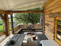 Unsere Blockhütte mit Grillstelle, Getränkeautomat und voll eingerichteter Küche lädt zum Grillen und gemütlichen Abenden mit anderen Gästen sowohl draußen als auch drinnen ein.